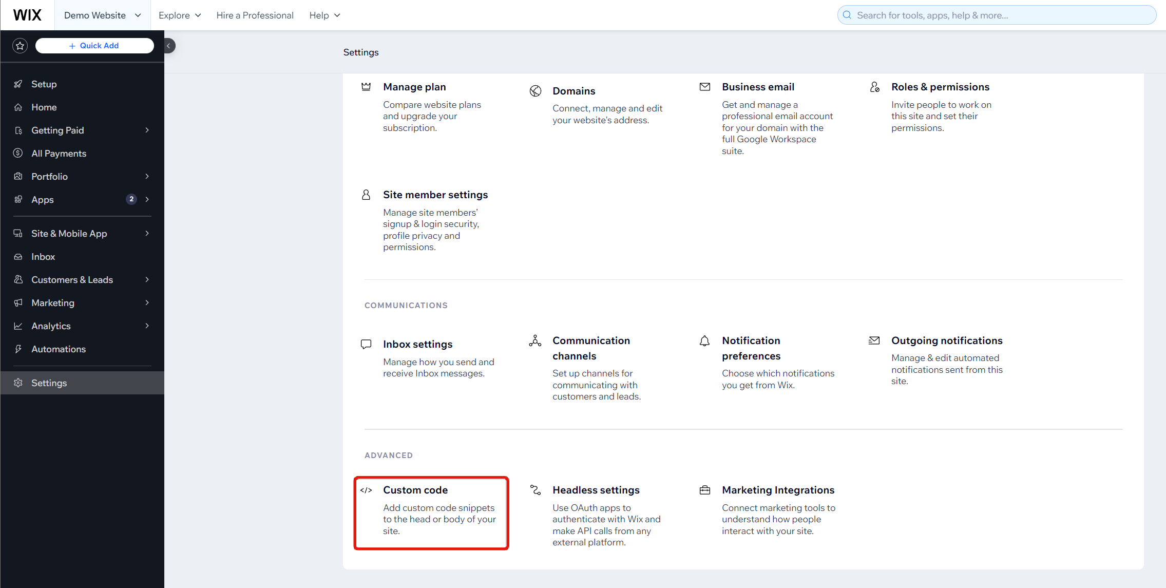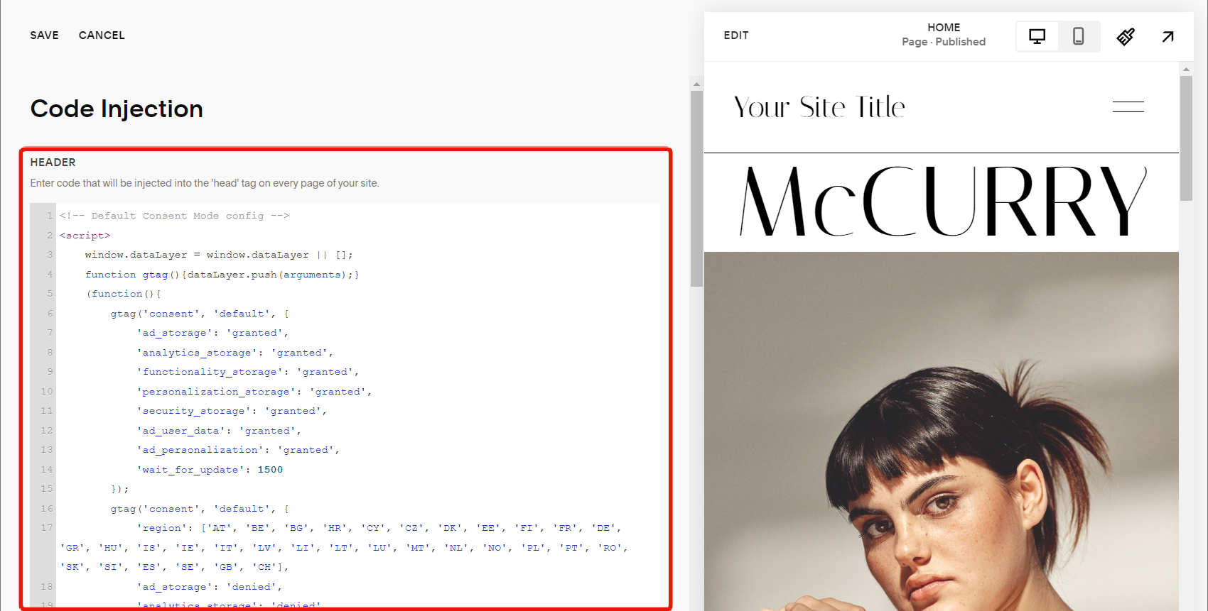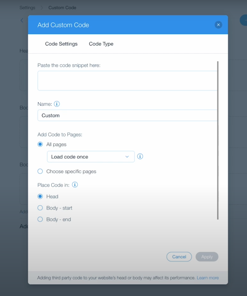 4. Add the On-Page Code from Step 1 to the Head code section.