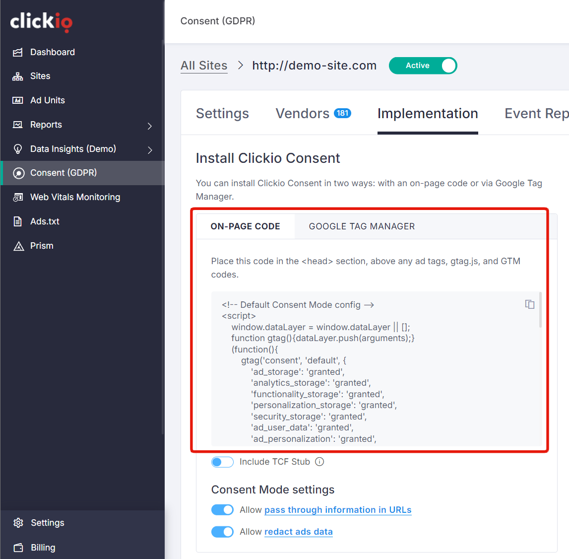 1. Log into your Clickio account. In the Consent > Implementation tab, find the "On-page Code".