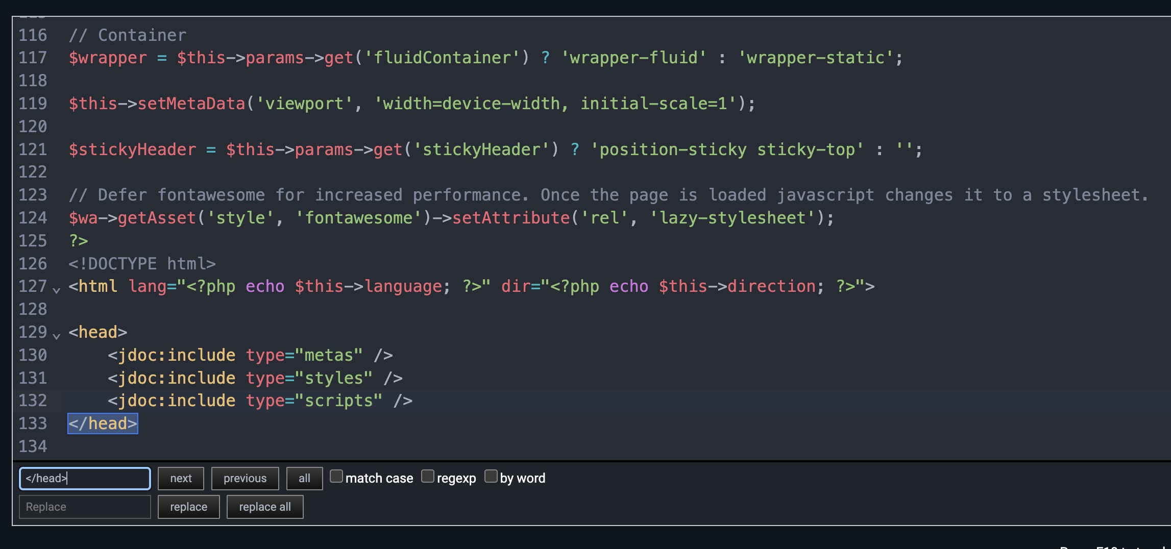 5. Press Ctrl+F (Cmd+F) and search </head> tag.